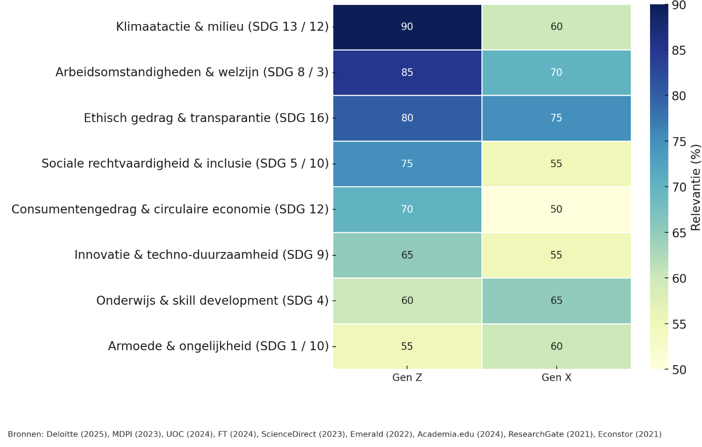 Internationale onderzoeken, onder meer van Deloitte (2025) en de Financial Times (2024), bevestigen dat jonge professionals nadrukkelijk kijken naar de milieuprestaties van hun werkgever. De heatmap laat zien dat Gen Z (1997–2012) thema’s als milieu-impact, klimaat en ethiek hoog waardeert — maar dat bureaus hier weinig actie op ondernemen. Thema’s als inclusie en welzijn vaker worden genoemd, maar concrete maatregelen om de eigen CO₂-footprint te verlagen blijven achter.